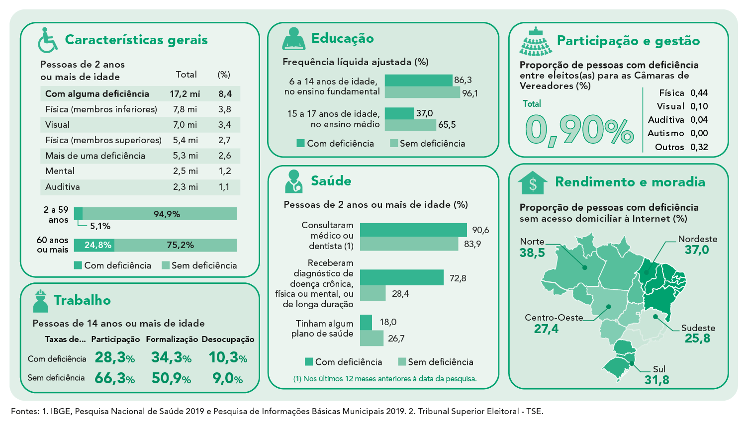 Como contribuição a esses estudos, o IBGE traz, neste gráfico, uma análise centrada nas condições de vida das pessoas com deficiência no país e mostra as desigualdades sociais observadas em algumas dimensões para as quais há disponibilidade de dados sobre o tema, destacando-se a Pesquisa Nacional de Saúde – PNS 2019, realizada pelo Instituto, como a principal fonte de informação explorada. Além da caracterização sociodemográfica das pessoas com essa condição, outras perspectivas importantes para o seu bem-estar – trabalho, educação, saúde, participação e gestão, rendimento e moradia – encontram-se também contempladas. Para esse fim, foram utilizados registros referentes às eleições municipais mais recentes compilados pelo Tribunal Superior Eleitoral – TSE; dados do Censo Escolar do Instituto Nacional de Estudos e Pesquisas Educacionais Anísio Teixeira – INEP; e estatísticas sobre as iniciativas públicas e a realidade política relativas a essa temática, no nível municipal, provenientes da Pesquisa de Informações Básicas Municipais – Munic, também realizada pelo Instituto.